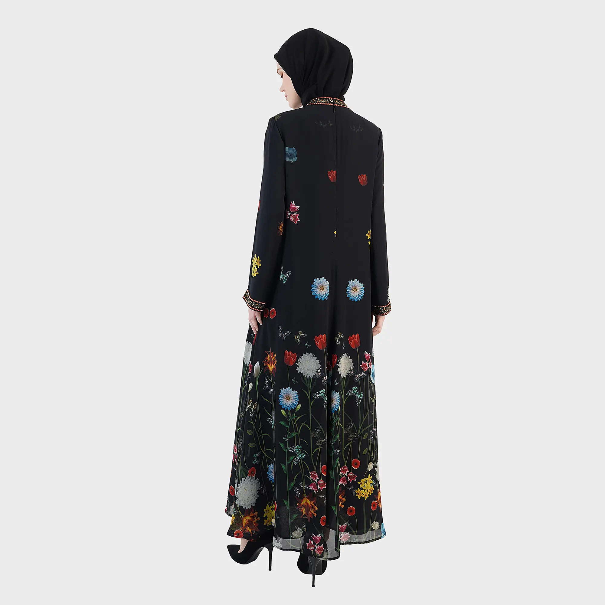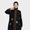 Blending elegance with floral softness, the Lylia Bloom Abaya is designed for women who seek a graceful yet artistic look. Floral motifs blooming from the hem create the illusion of a vibrant night garden. Vertical embroidery adds a tall, luxurious silhouette, perfect for special occasions or stylish daily wear.