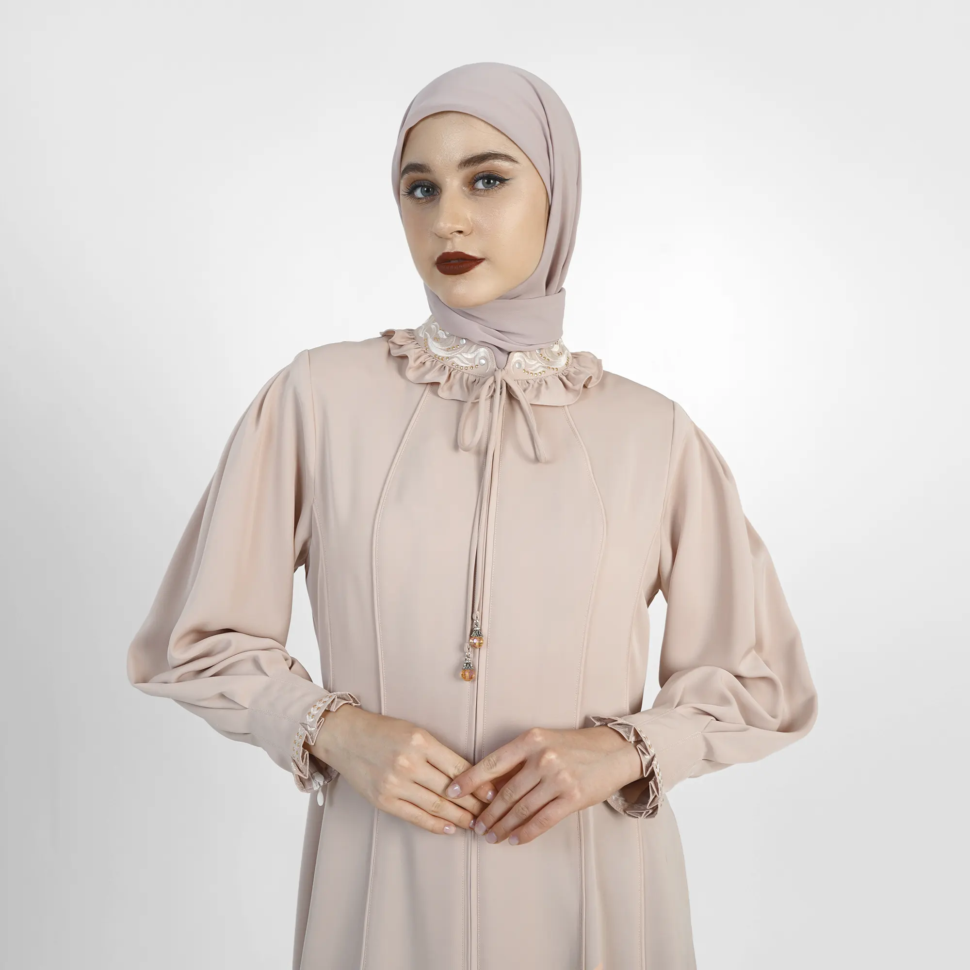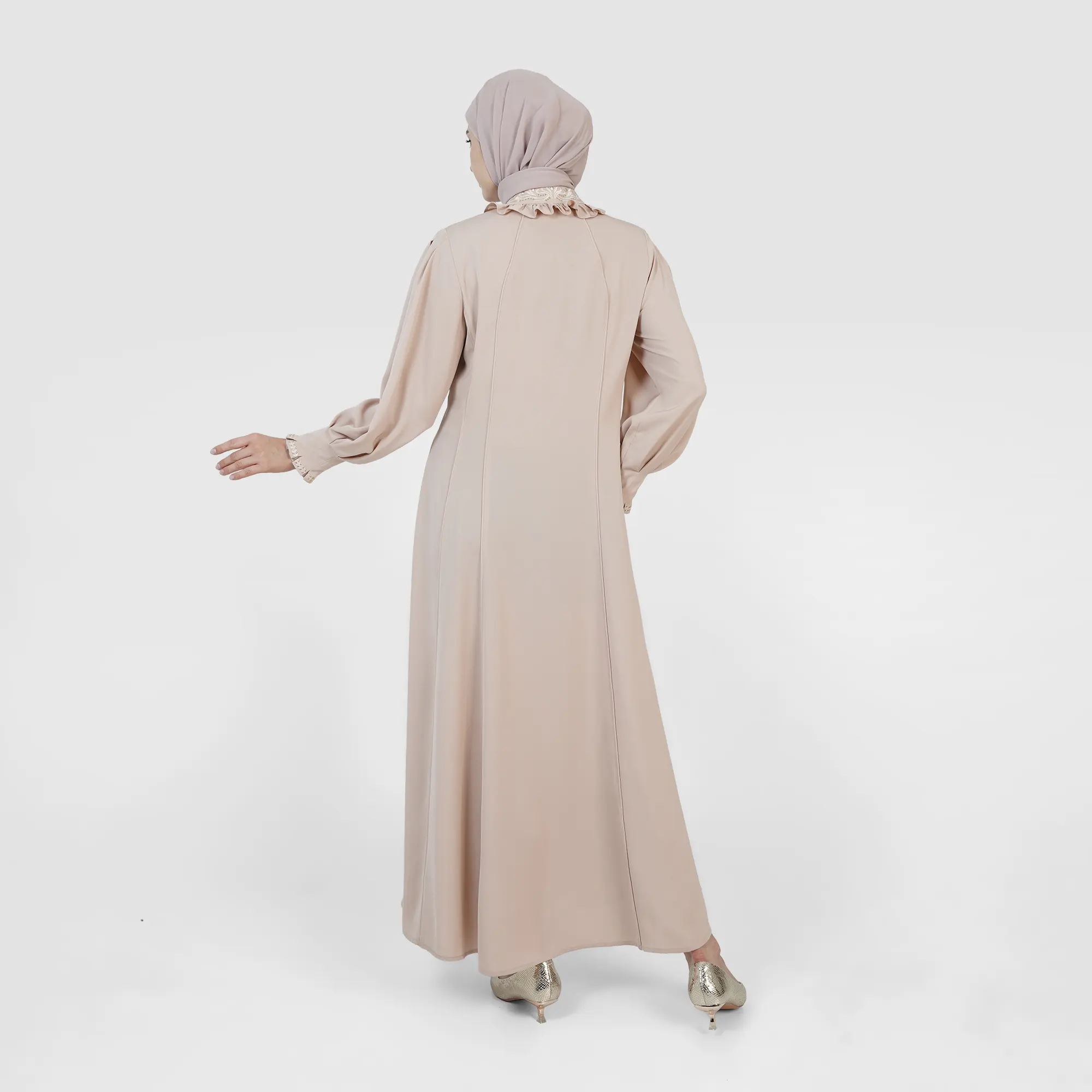 The Saffra Grace Abaya is a premium interpretation, showcasing a clean silhouette with subtle, refined details that enhance its graceful and classy appeal. Its perfectly draped, flowy cut creates an effortlessly feminine look, ideal for formal occasions or refined daily wear.Designed for comfort and a neat visual, the Saffra Grace Abaya is the perfect choice for Muslimahs who value simplicity with high quality.