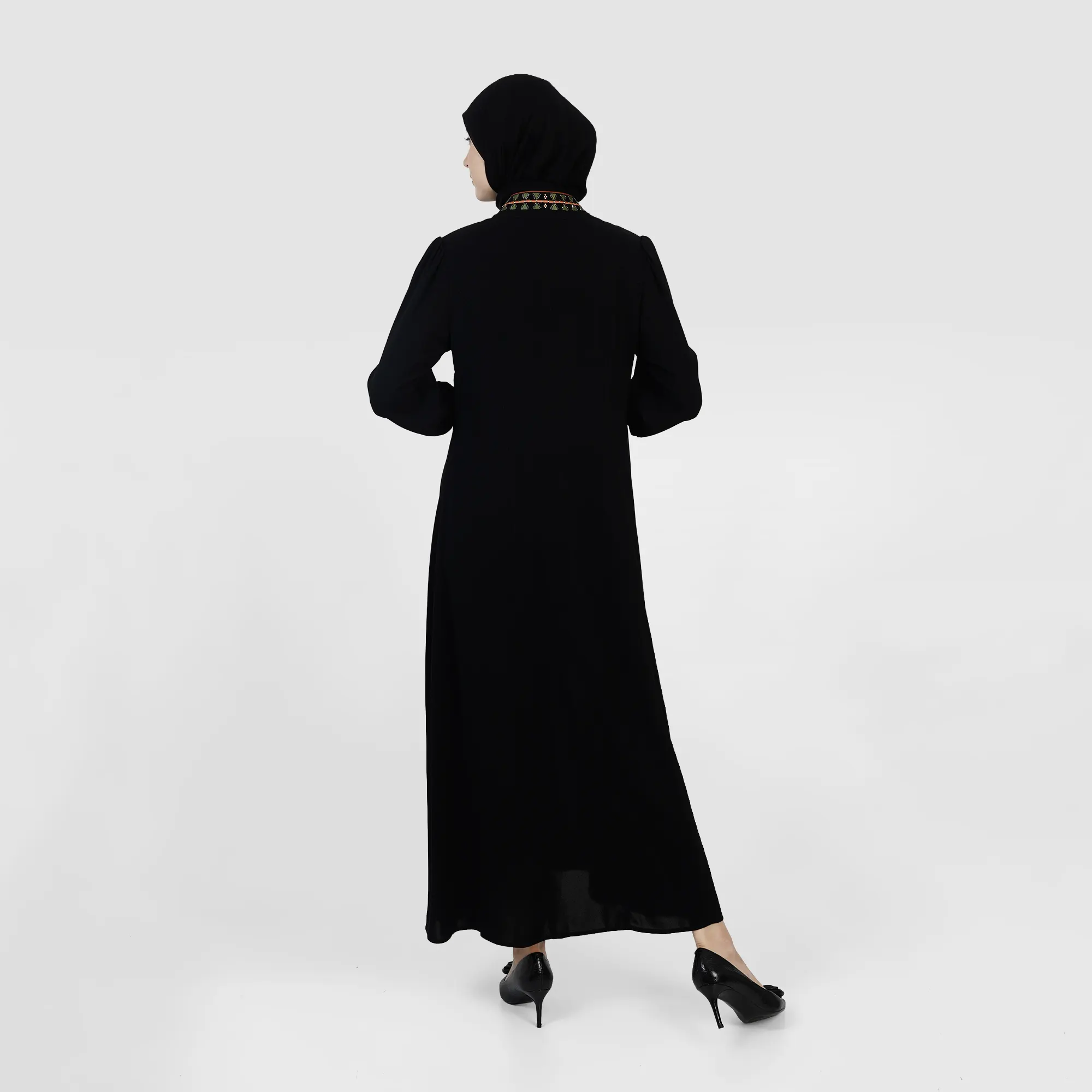 The Fioreline Vein Abaya embodies the beauty of organic lines inspired by floral patterns, translated into a graceful and flowing abaya silhouette. As a Premium Abaya, this design features exclusive embroidery details on the neckline and cuffs, creating a subtle feminine accent without compromising a strong impression.Its cut is designed to provide a neat drape and elegant proportions, making it a perfect choice for formal moments, special events, or refined everyday wear.
