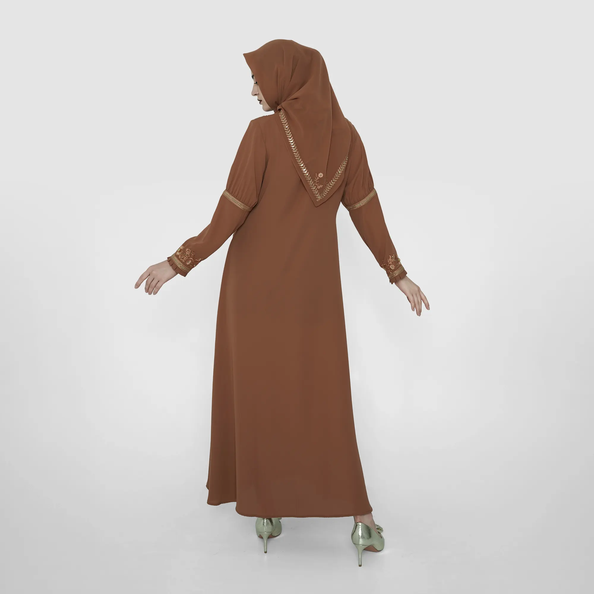 The Zulefleur Abaya is a premium piece, blending classic floral embroidery with a modern, elongated silhouette. Its vertical lines elegantly enhance the figure, creating a graceful yet luxurious impression. Every element is designed for a sophisticated, understated look, perfect for formal events and special occasions.