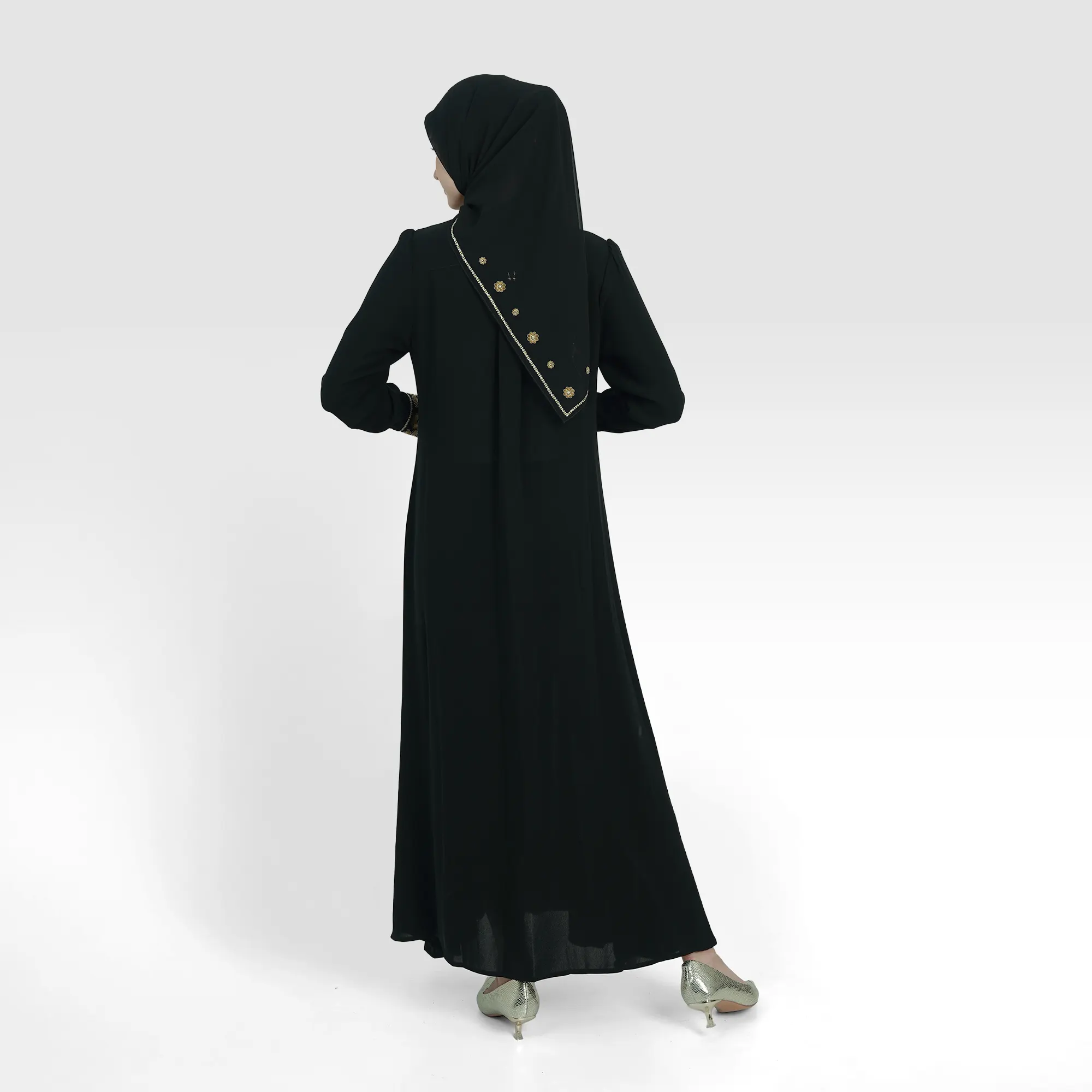 The Frill Grace Abaya exudes elegance through its delicate frill details and vertical embroidery, creating a slender and luxurious impression. The blend of feminine design and a flowy silhouette makes this Premium Abaya the perfect choice for a graceful, modern, and classy look.