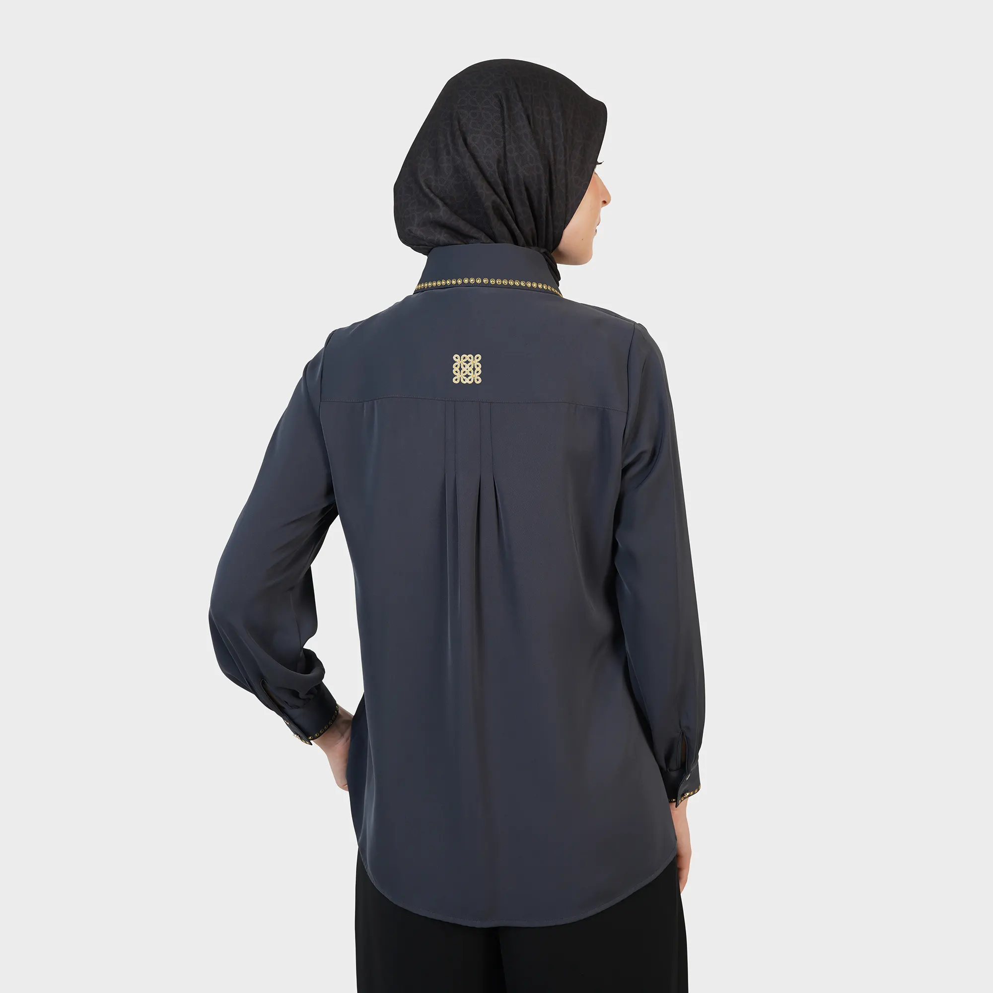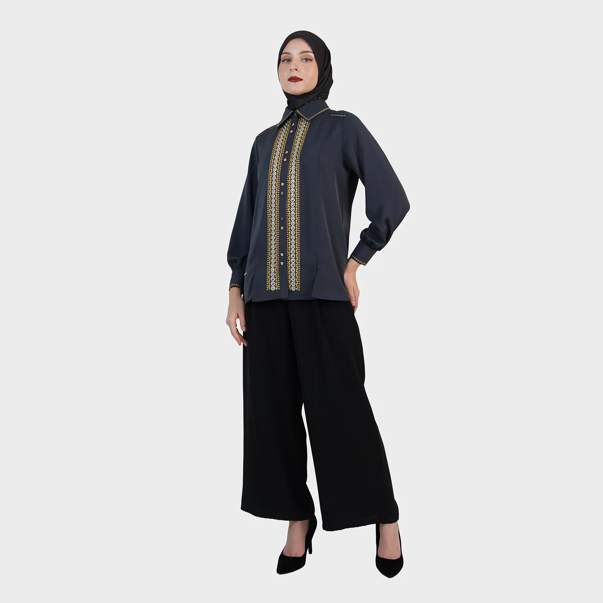 The Lyra Rootline Blouse offers a modern interpretation of the Muslimah Blouse with precise detailing. Vertical line accents on the front create an elongated silhouette, while neatly arranged embellishments impart an elegant character without being ostentatious.Designed for women who appreciate the balance between structure and softness, this blouse is easily styled for both formal and semi-formal occasions, maintaining a refined impression.