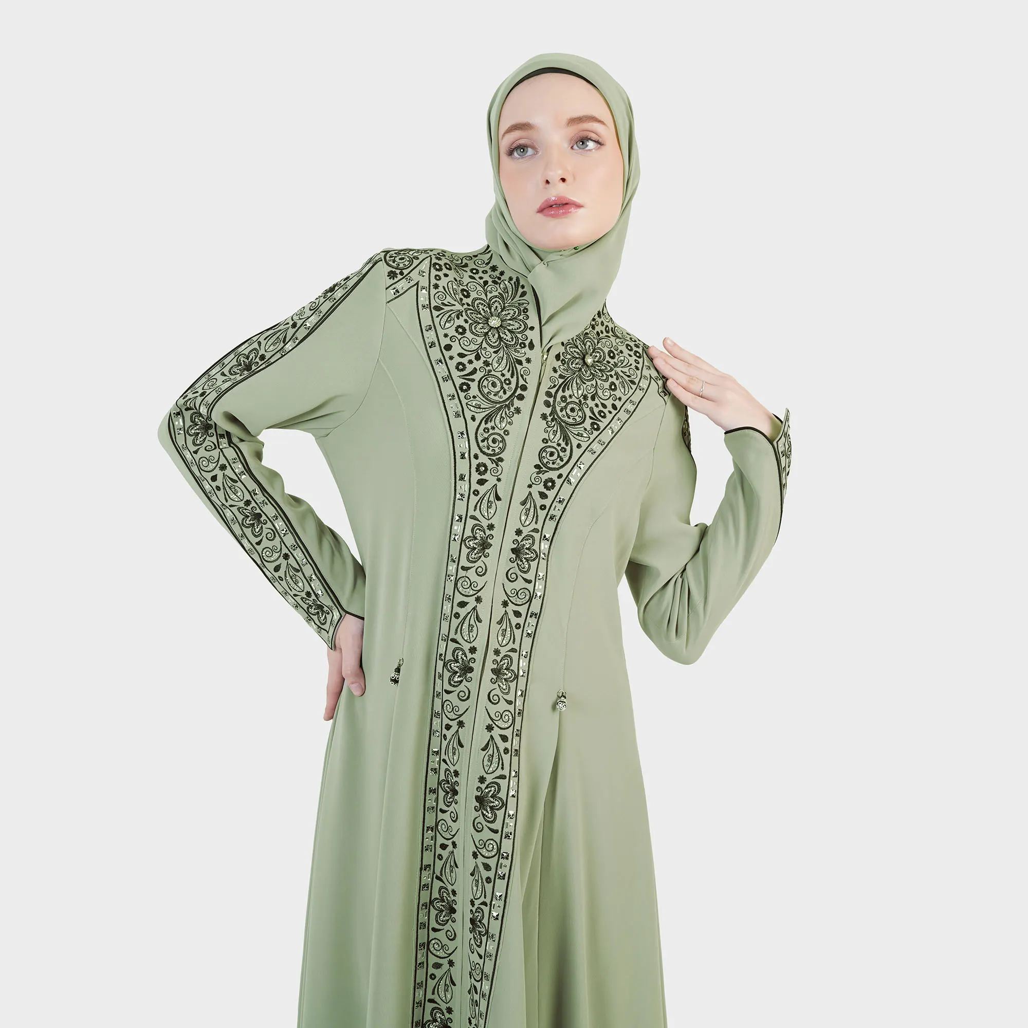 The Mirage Royale Abaya is the embodiment of captivating luxury and elegance. Designed with intricate embroidery details along the front and sleeves, creating a majestic silhouette that exudes a regal aura. The elegant cut with a minimalist waist tie adds a modern touch to a classic style, making it a perfect choice for special occasions.