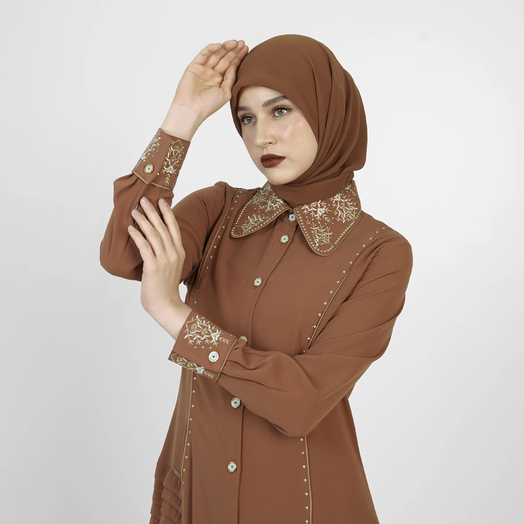 The Velora Dusk Tunic offers a neat silhouette with delicate details that enhance its elegant character. Designed for the modern Muslimah, this tunic combines vertical lines that elongate the look with distinctive HIKMAT accents, creating a balance between structure and softness. An ideal choice for formal to semi-formal appearances with a refined impression.