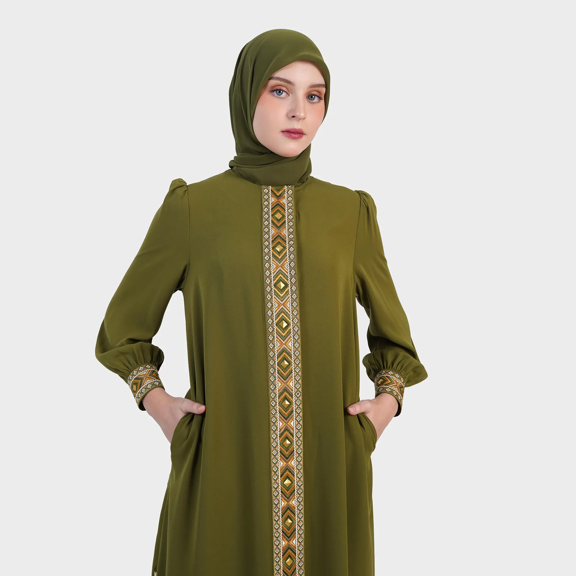 Tegas dalam garis, kuat dalam karakter, Eth Linea Abaya menghadirkan interpretasi modern dari Abaya Premium dengan sentuhan etnik yang refined. Detail garis vertikal bermotif menjadi pusat perhatian, menciptakan ilusi siluet yang lebih jenjang sekaligus memperkuat identitas visual yang khas.Perpaduan antara struktur yang clean dan aksen etnik yang subtle menjadikan abaya ini pilihan ideal untuk tampilan elegan yang tidak biasa, simple, namun penuh statement.