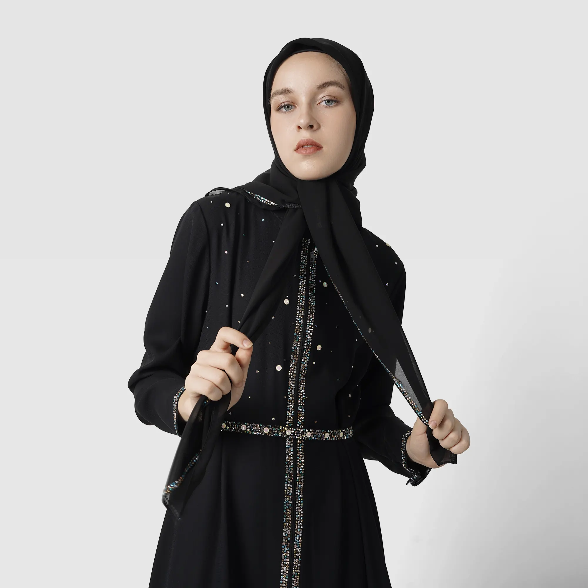 Nebulis Gleam Abaya menghadirkan sentuhan elegan dengan detail kilau halus yang memanjang di bagian depan. Desainnya memadukan siluet anggun dan ornamen modern, menjadikannya pilihan tepat untuk tampilan formal maupun acara spesial. Koleksi ini menegaskan bahwa Abaya bukan hanya busana, melainkan juga simbol keanggunan yang berkelas.