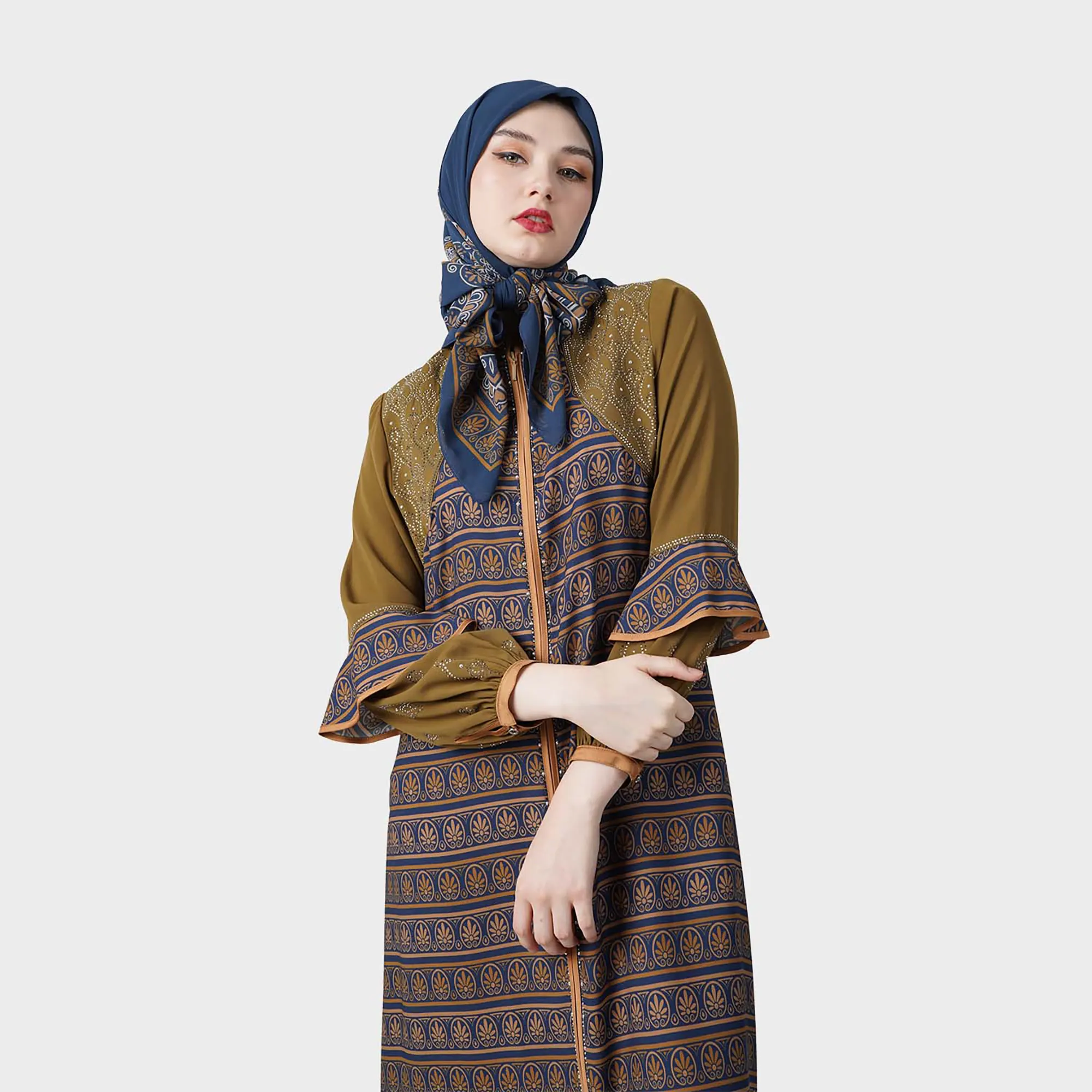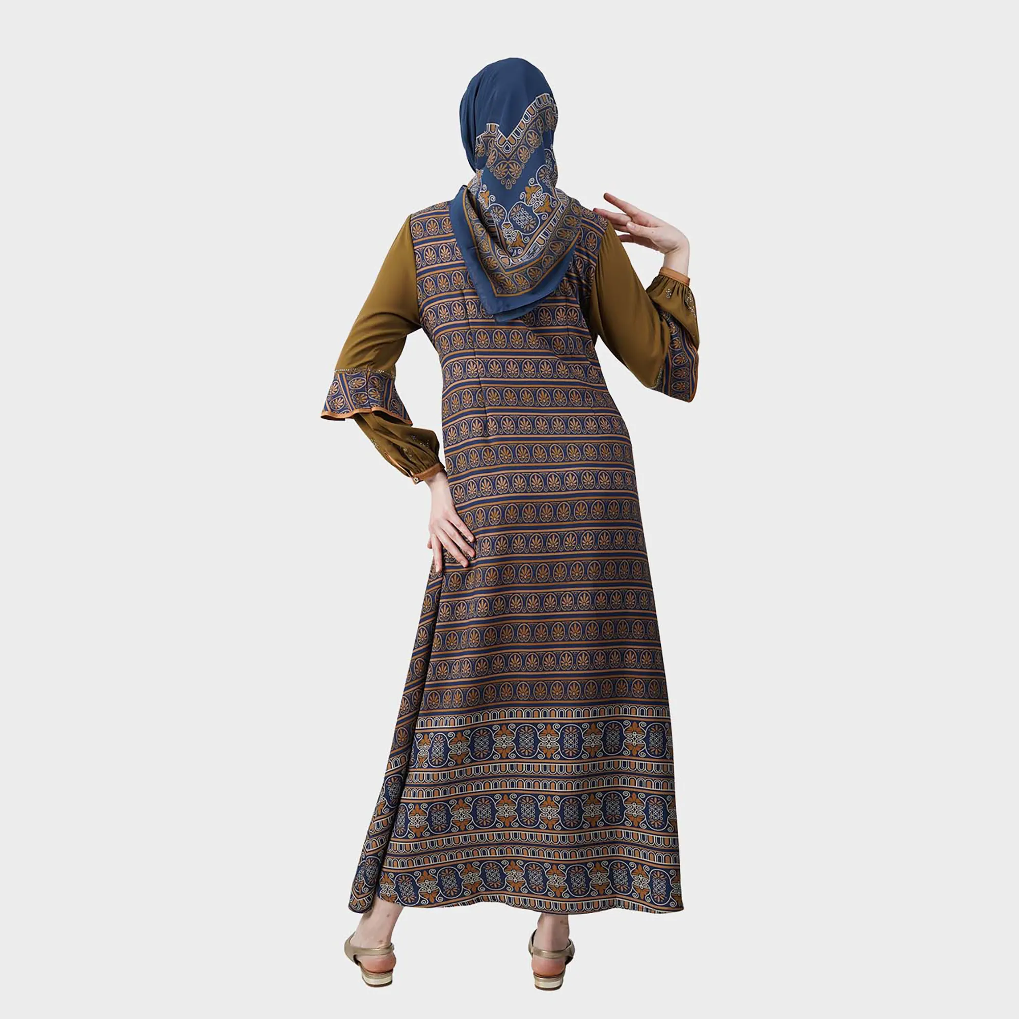 Desain Abaya Printing dengan pola etnik simetris bernuansa klasik.