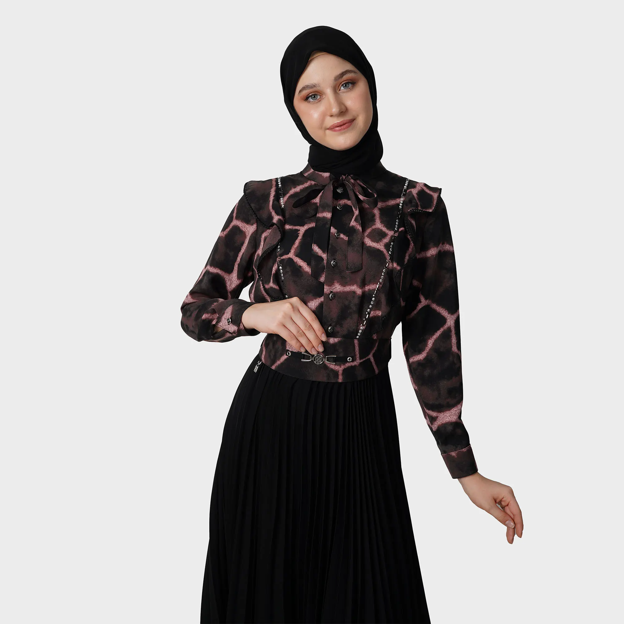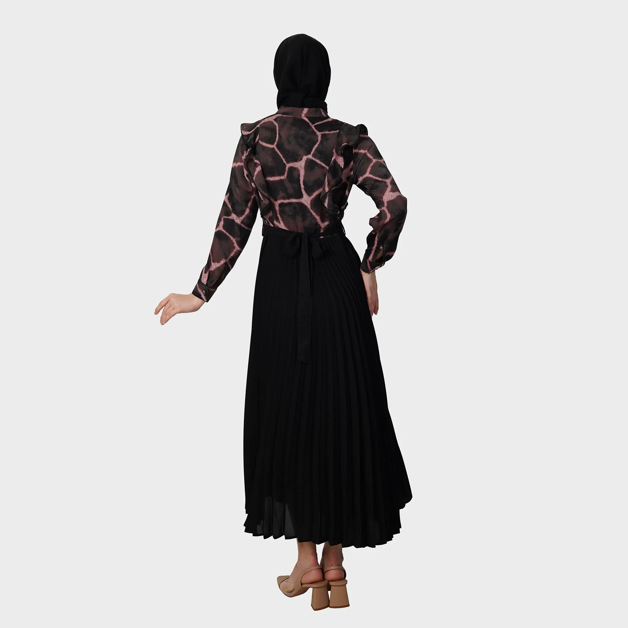 Silken Rift Abaya menghadirkan sentuhan artistik melalui motif unik menyerupai celah halus pada kain, menciptakan tampilan modern yang tetap memancarkan kemewahan. Potongan longgar dan detail elegan membuat abaya ini cocok untuk berbagai momen, dari acara formal hingga santai berkelas.