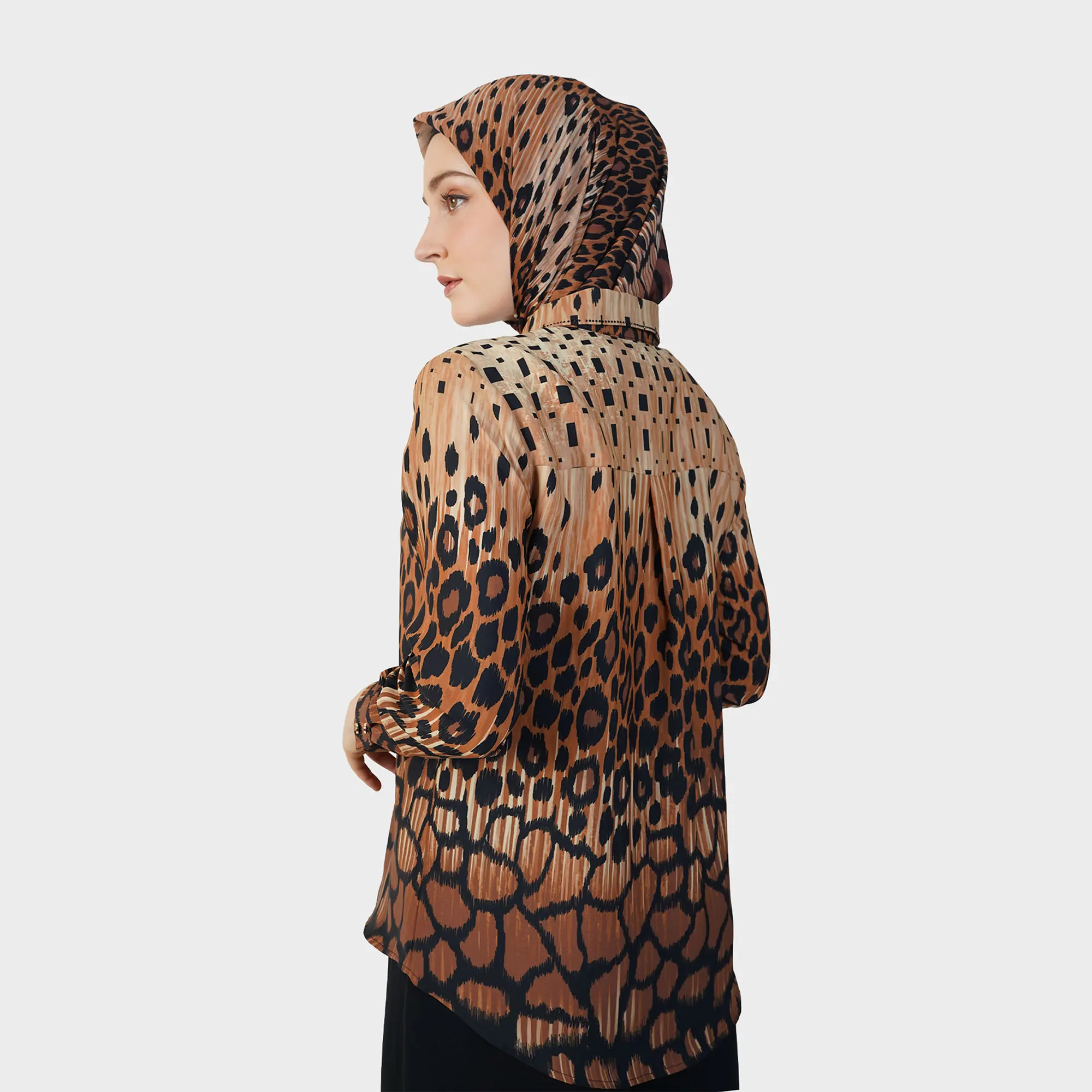 Perpaduan motif yang berani dengan siluet yang elegan. Leopard Lines Blouse menghadirkan karakter kuat melalui permainan pola leopard yang berpadu dengan garis vertikal yang dinamis, menciptakan tampilan Blouse Premium yang modern dan penuh statement. Desainnya memberikan keseimbangan antara kesan edgy dan refined, menjadikannya pilihan tepat untuk gaya yang percaya diri dan sophisticated.