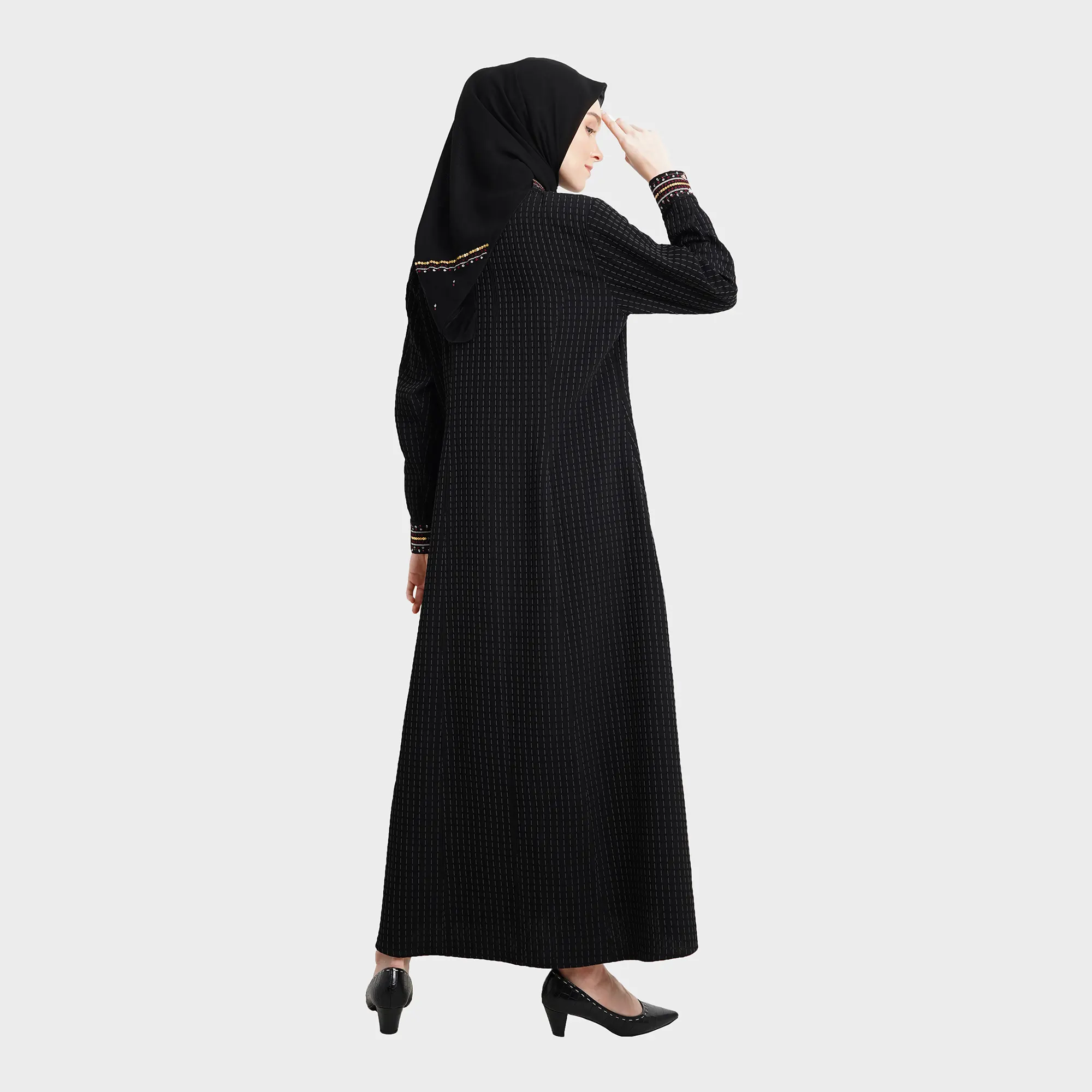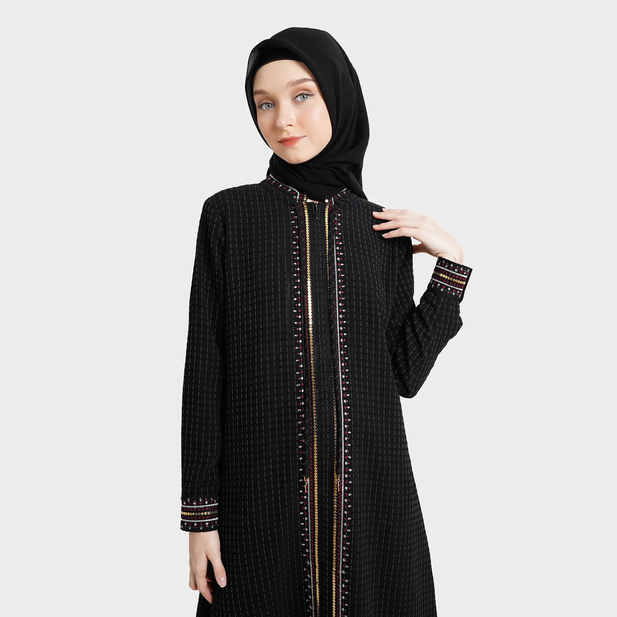 Pancarkan kemewahan di setiap langkah dengan Nocturne Gold Abaya. Desain berkelas dengan aksen list berkilau memberikan sentuhan modern yang elegan. Dilengkapi dengan kancing depan dan tali pinggang adjustable untuk kenyamanan maksimal.