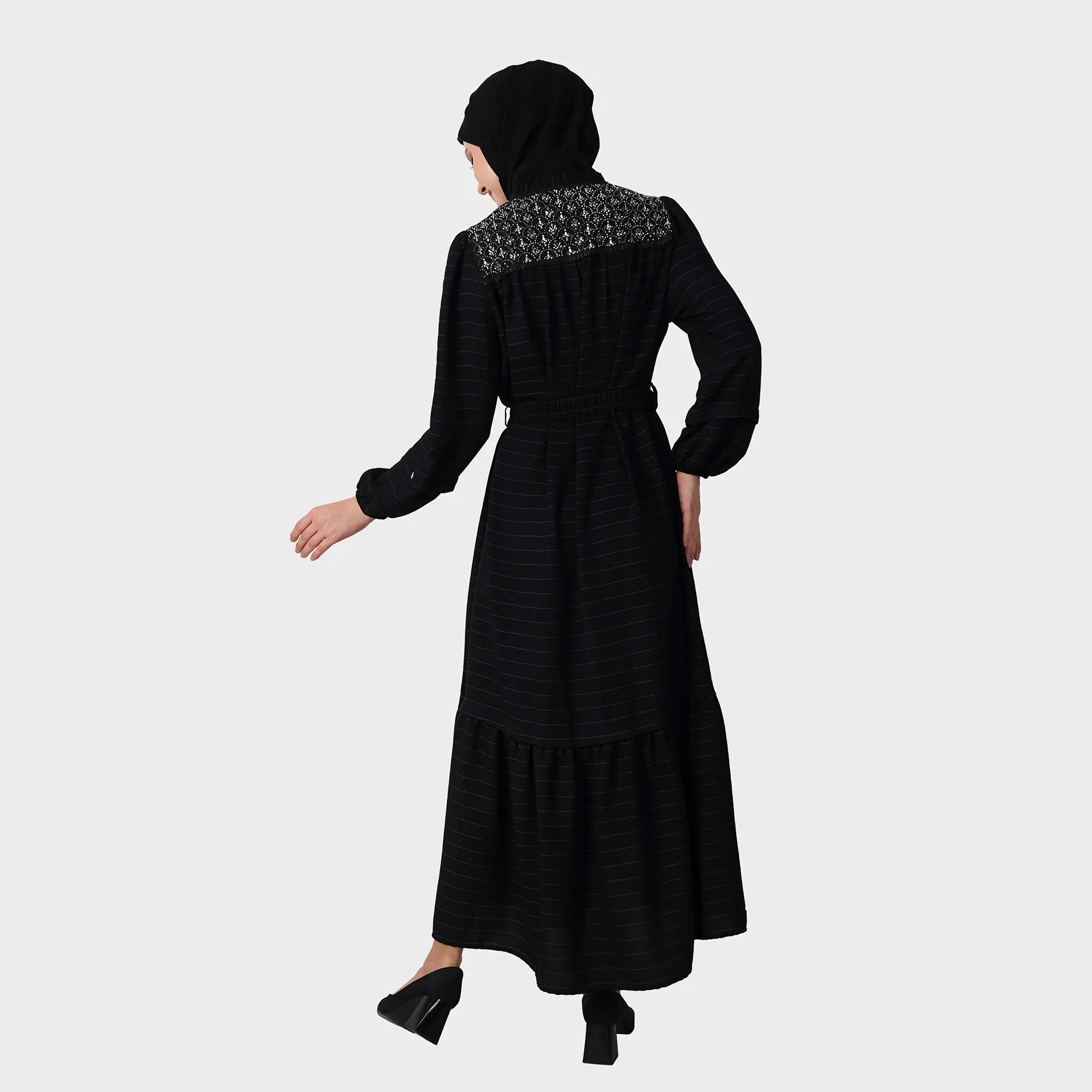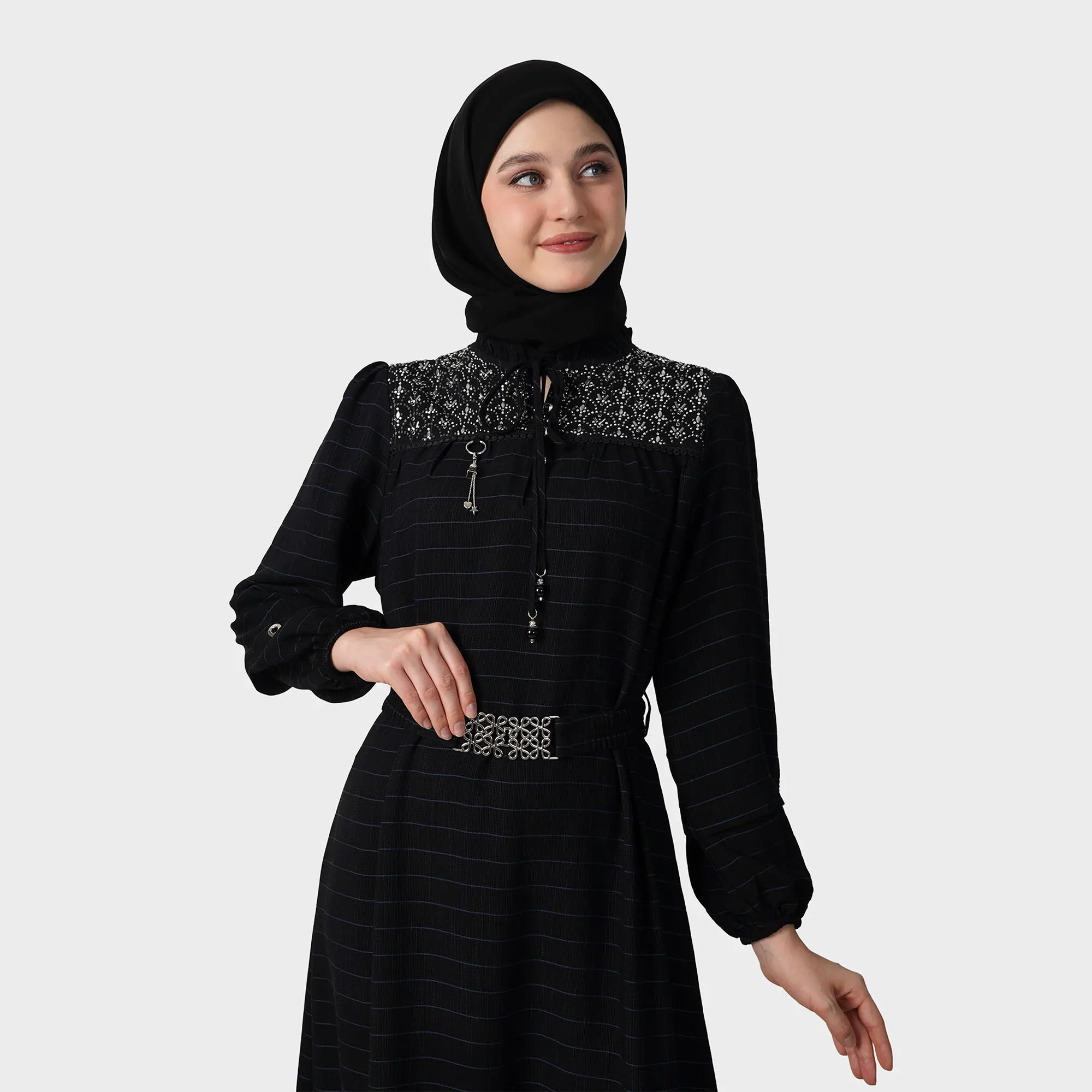 Gratia Drame Dress adalah dress muslimah modern dengan sentuhan garis halus dan detail ornamen di bagian dada yang memberikan nuansa anggun. Desainnya berpadu dengan potongan elegan dan ikat pinggang dekoratif, menjadikan dress ini pilihan istimewa untuk acara formal maupun santai.